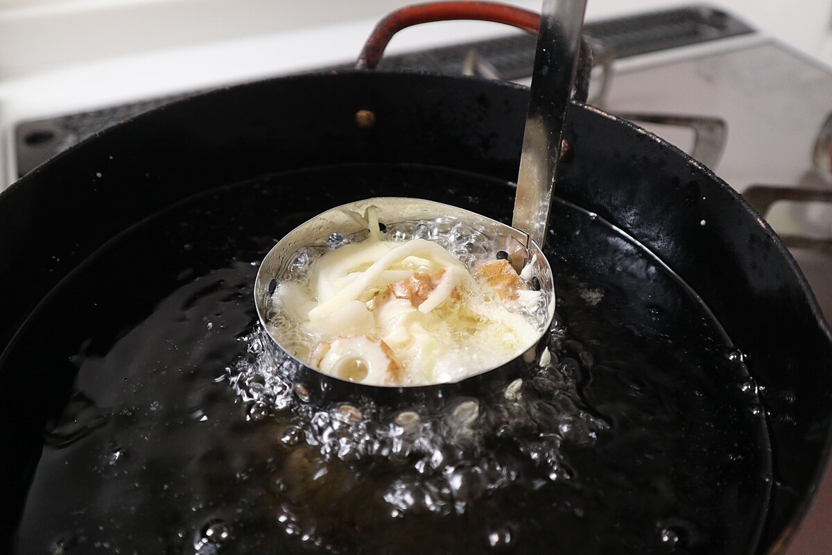 天ぷら粉を加えて、具材にからめ、180度の油でかき揚げをあげます。