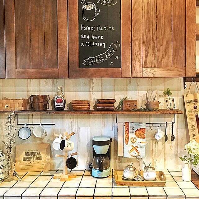キッチン背面もアカシア食器などを見せる収納にしています。