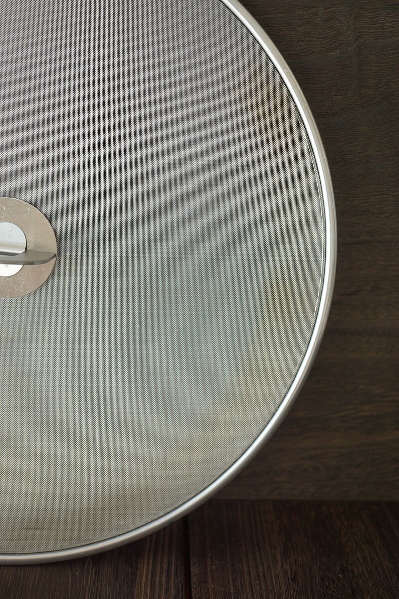 IKEAの油はね防止用ふたは真ん中の金具を立てて使います。 金具が熱くなるので、鍋つかみを使用しなければいけません。