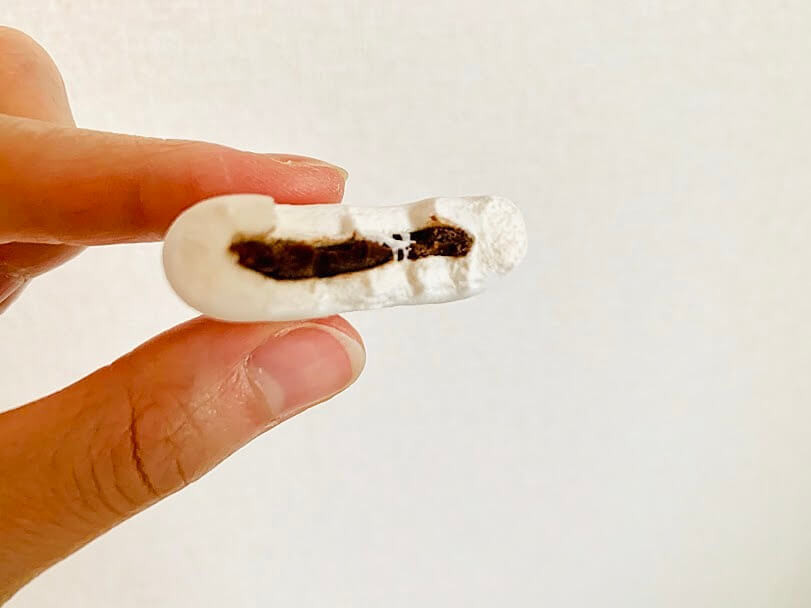 あ!噛むとよくわかる!常温の時の伸びる感じが全くなく、歯切れのいいマシュマロになりました。口の中でのくちどけがいまいち……。そしてチョコレートがもっと硬くなりました!! あれ?マシュマロの良い所を失っちゃった?