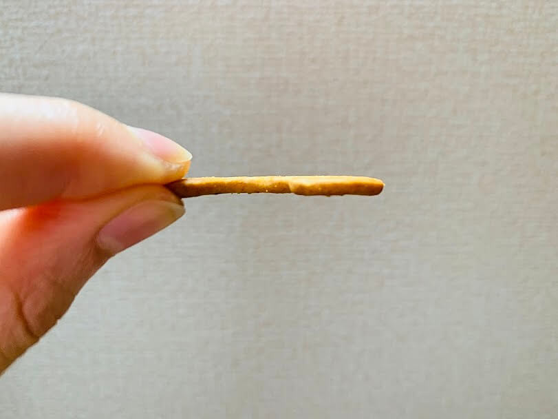 と~っても薄いんです!そこがいいんですよ。かりっと軽快な歯ざわり、カリカリサクサクです。例えるなら……ハーベストみたいな、ビスコの外側のような、軽い噛み応えです。