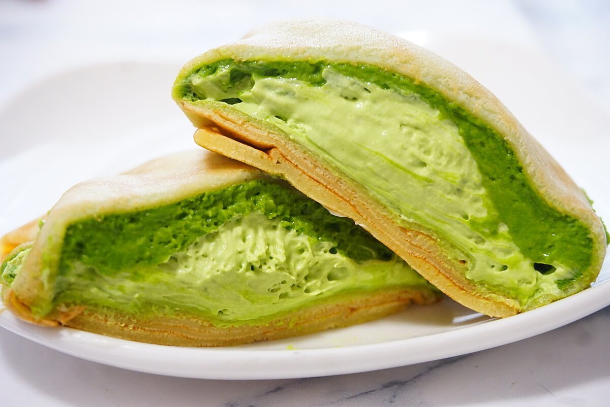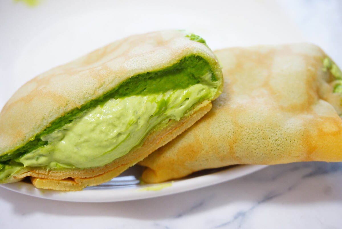 宇治抹茶を使った口どけなめらかなクリームと、ホイップクリームをもっちりとした食感のクレープ生地で包まれたスイーツです。