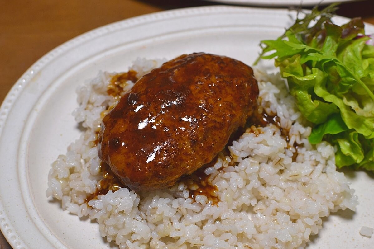 器にごはんを盛りその上にハンバーグをのせます。