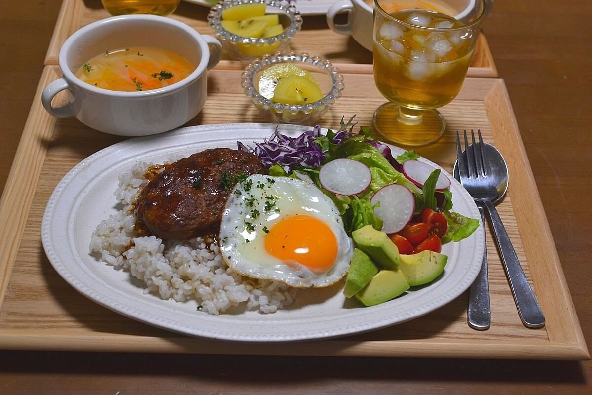 野菜を盛り付け目玉焼きをトッピングしたら、あっという間に「ロコモコ丼」の完成♪