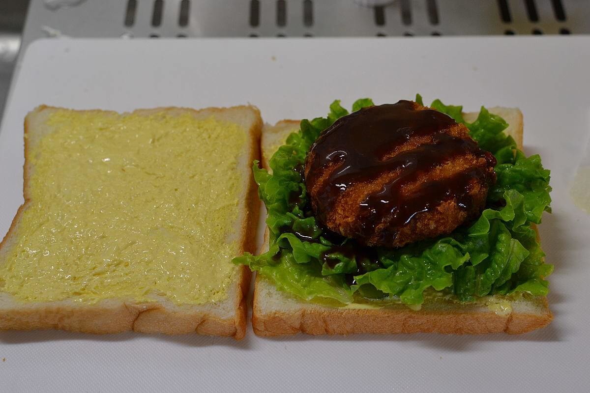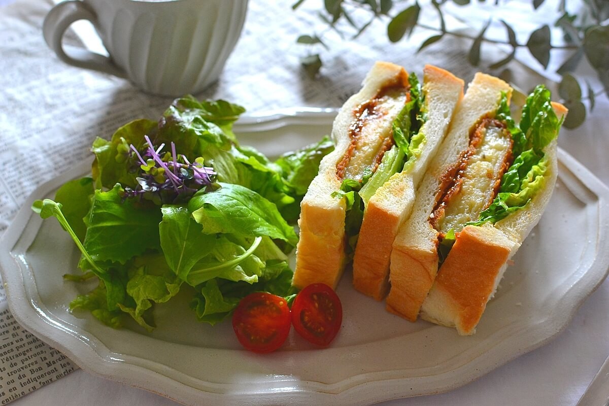 食パンにマヨネーズとマスタードを塗り、レタスとソースをかけたコロッケをサンドするだけで、おいしいコロッケサンドのできあがりです。