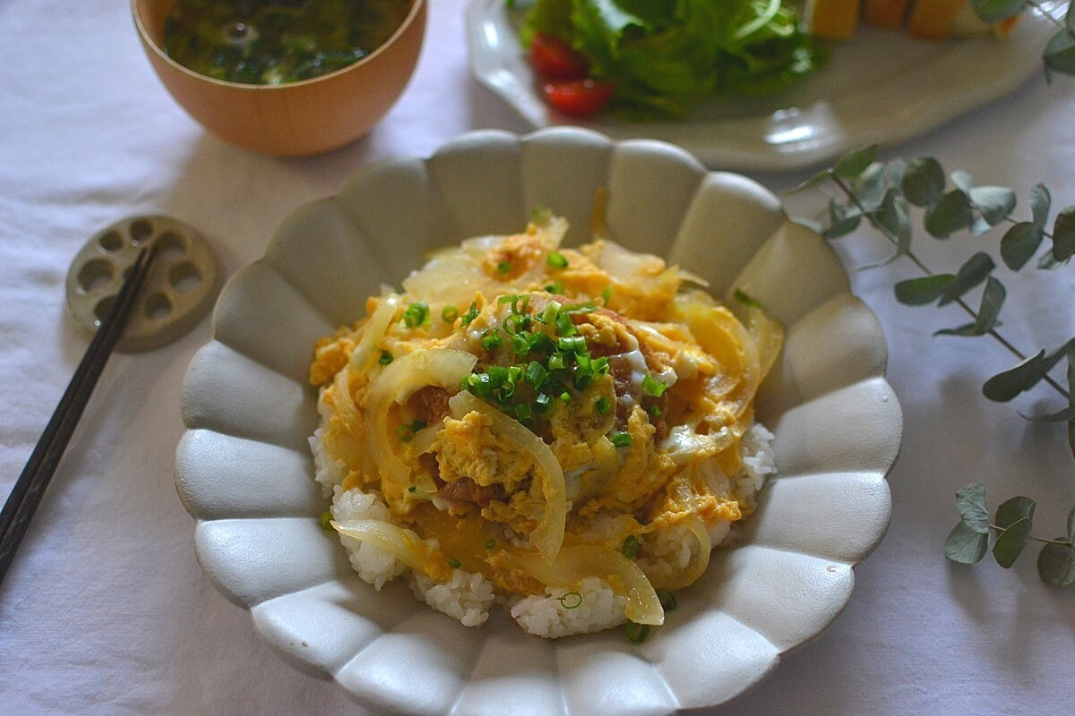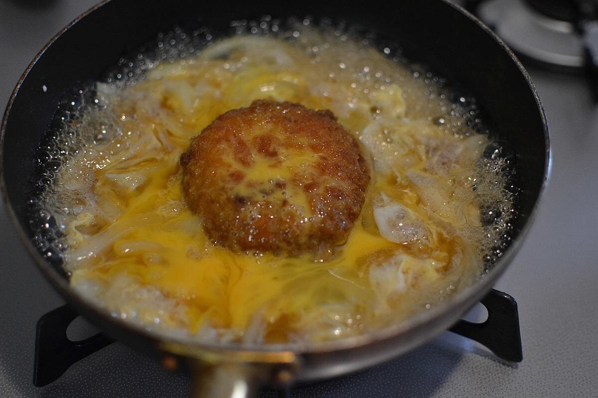 玉ねぎとコロッケをめんつゆで煮て、卵でとじたコロッケ丼のアレンジ料理も作成。