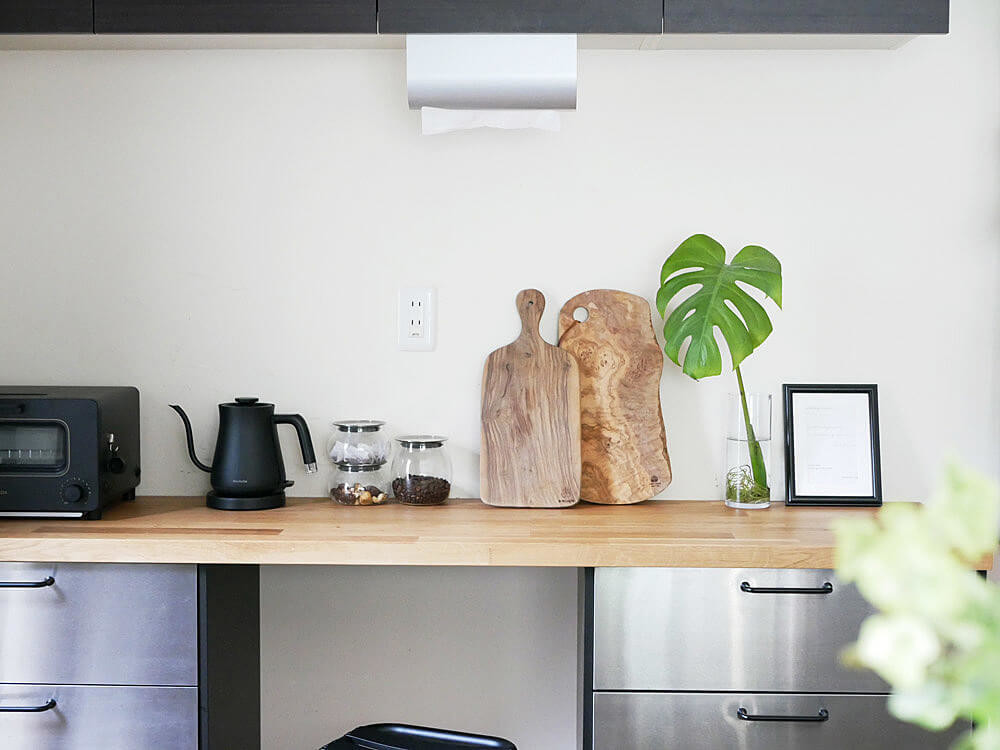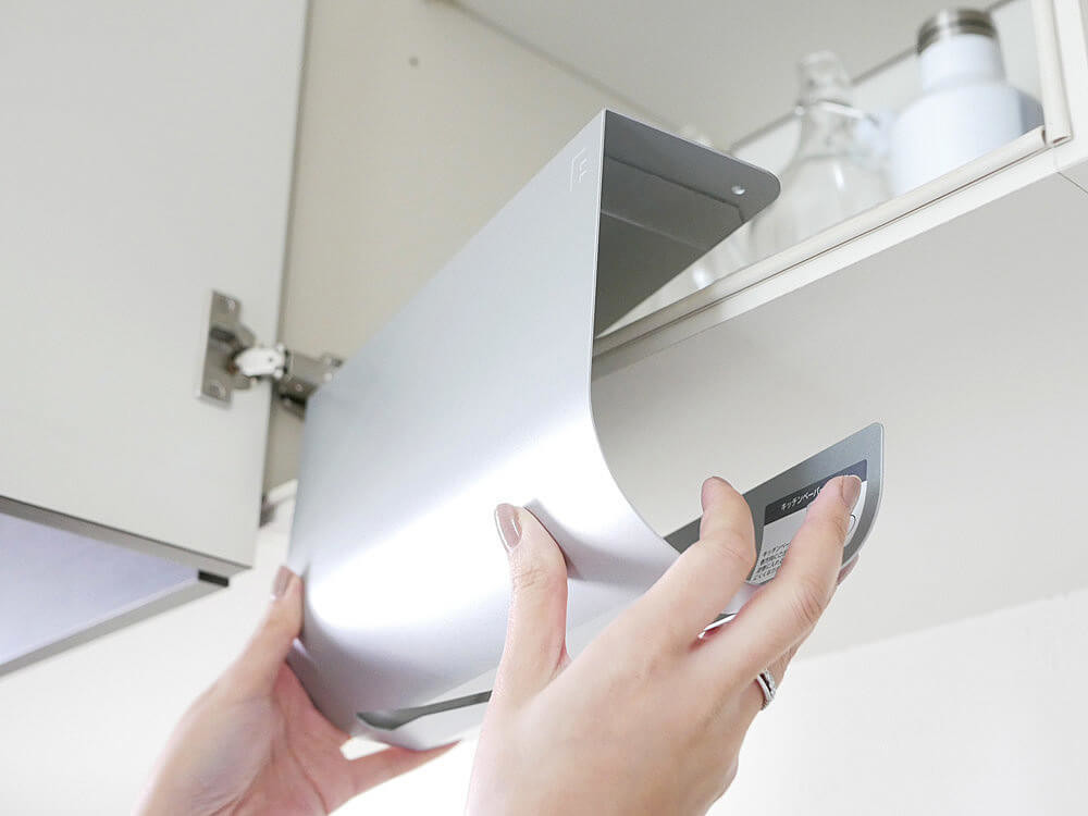 吊り戸棚下に設置することによってデッドスペースを有効活用できる上に、キッチンスペースもスッキリして見えるという効果も。