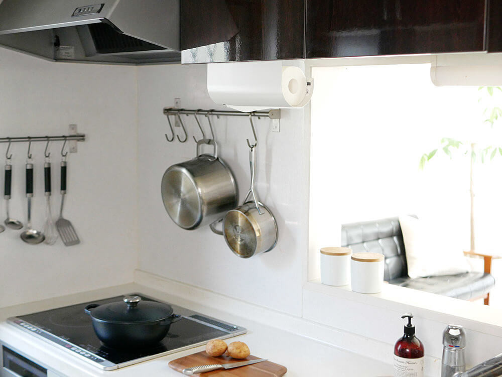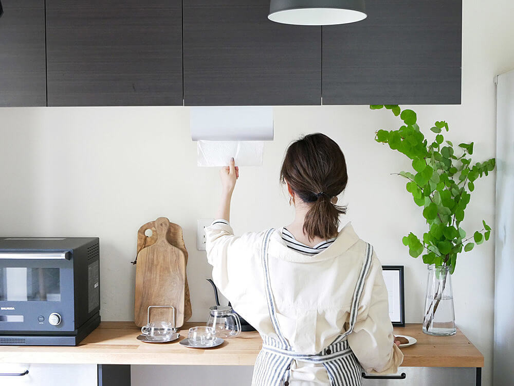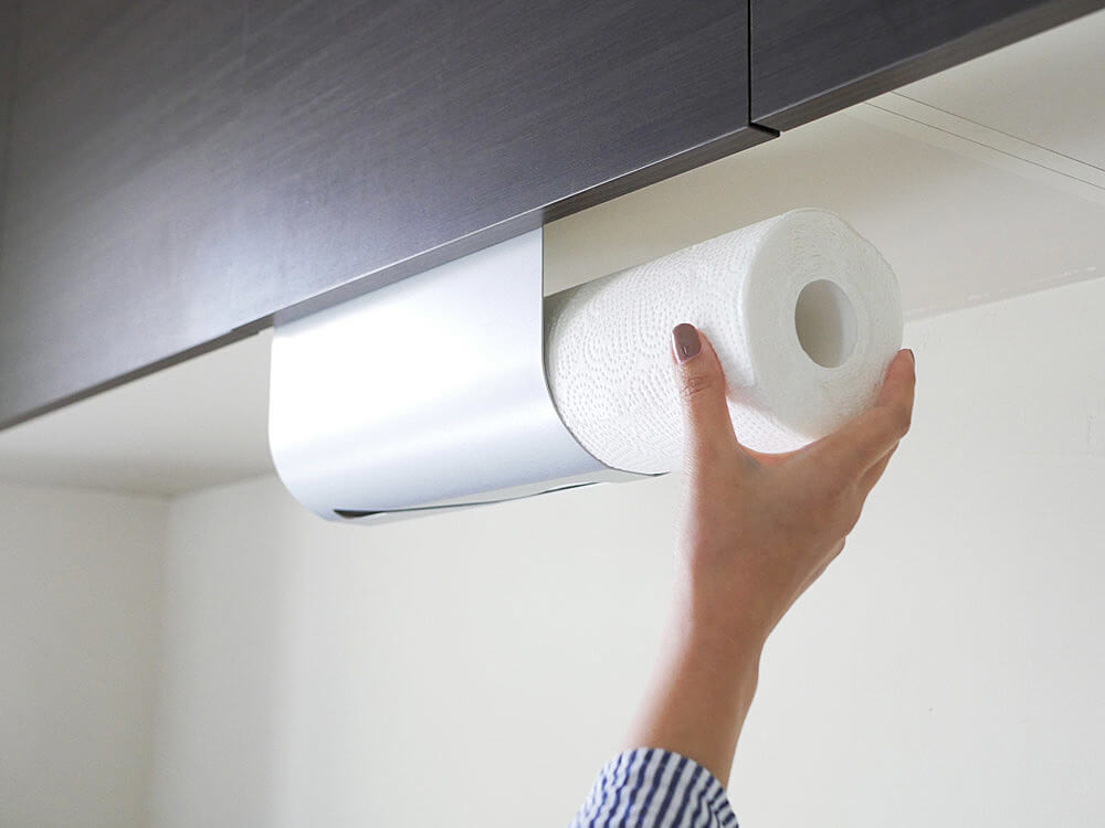 キッチン吊戸棚下の空間は「キッチンペーパー」収納場所へ!サッと下に引き出すノンストレス仕様