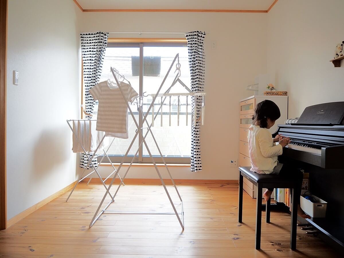 ここにはピアノなども置いてあるのですが、脱衣所は狭くリビングに干せる場所がないので、ここしか空間が取れなかったのです(汗)。