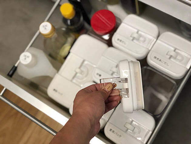 我が家ではお茶類のパックや、お砂糖、だしなどをいれています。