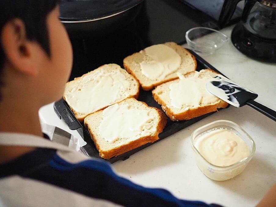 (1)食パン全面に、自家製マヨネーズを塗る。