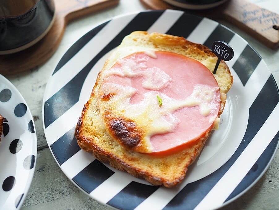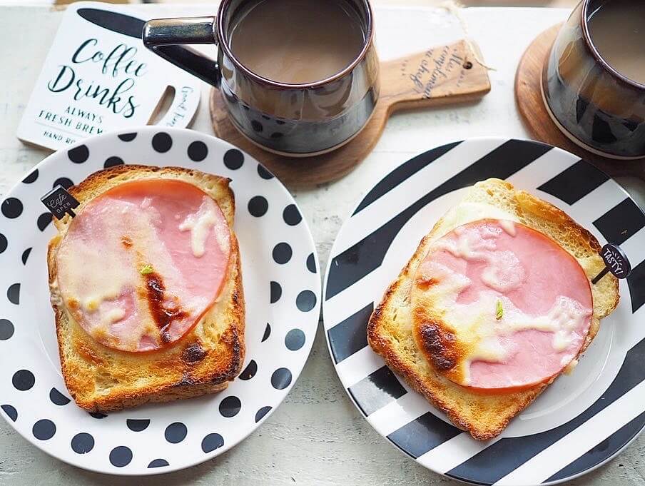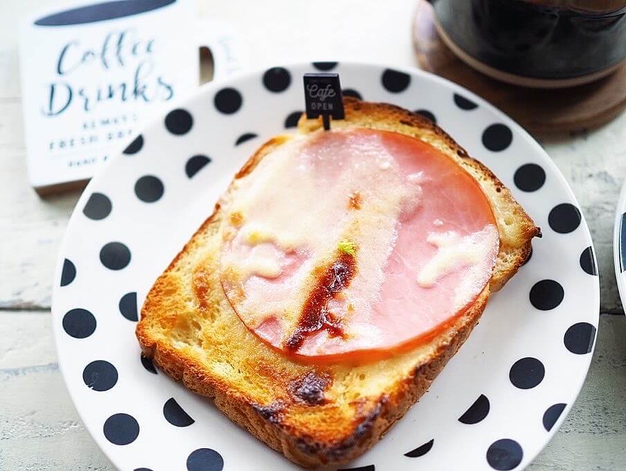(2)ハムを一度パンにのせ、その後ハムをひっくり返す。