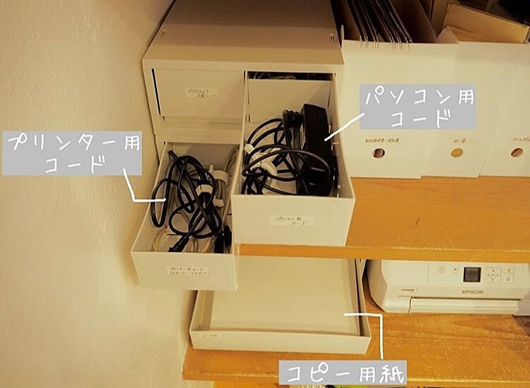 また、ちらりと下方に写ってますが、同シリーズの横長の引き出しに、コピー用紙も収納。A4サイズのコピー用紙がピッタリ収まるので、取り出しやすくなりました。