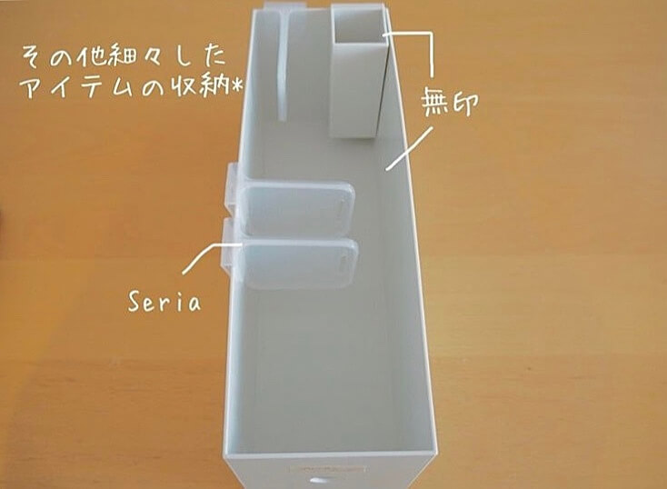 その他にもパソコンやプリンター関連で使うアイテムには、細かいものが色々ありますが……さて、無印良品とセリアのアイテムを組み合わせた上のケースには、一体何を収納しているでしょうか??