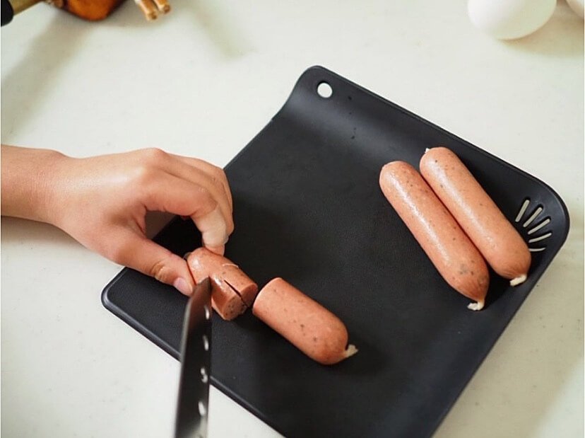 ①ウインナーを縦半分にカットし、足・手・口の切れ込みを入れる。