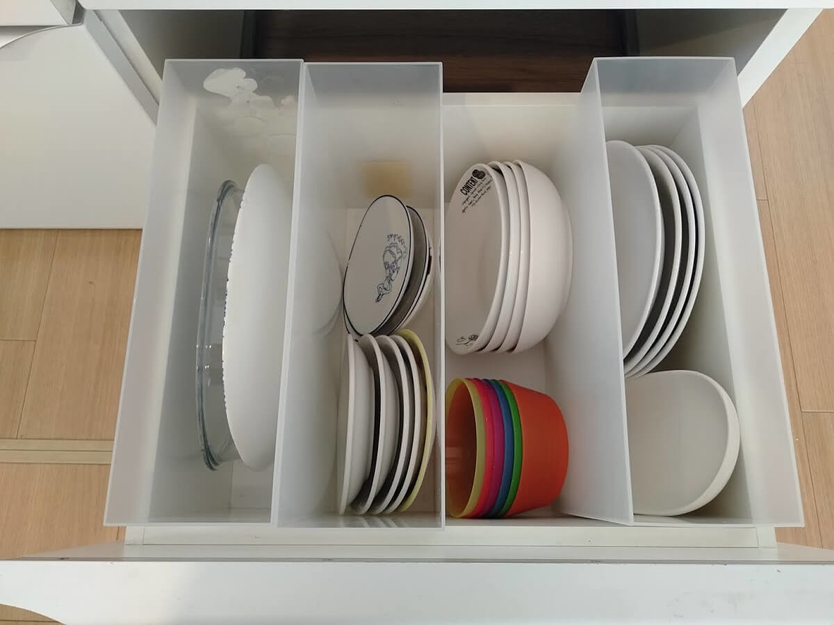 食器の収納は下段の引き出しに移動させようと思ったものの、重ねてしまうと下の方にどのお皿があるのかが分からず、取り出す時にも上のお皿を一旦どかす必要があり、非常に使い勝手が悪くなってしまいます。
