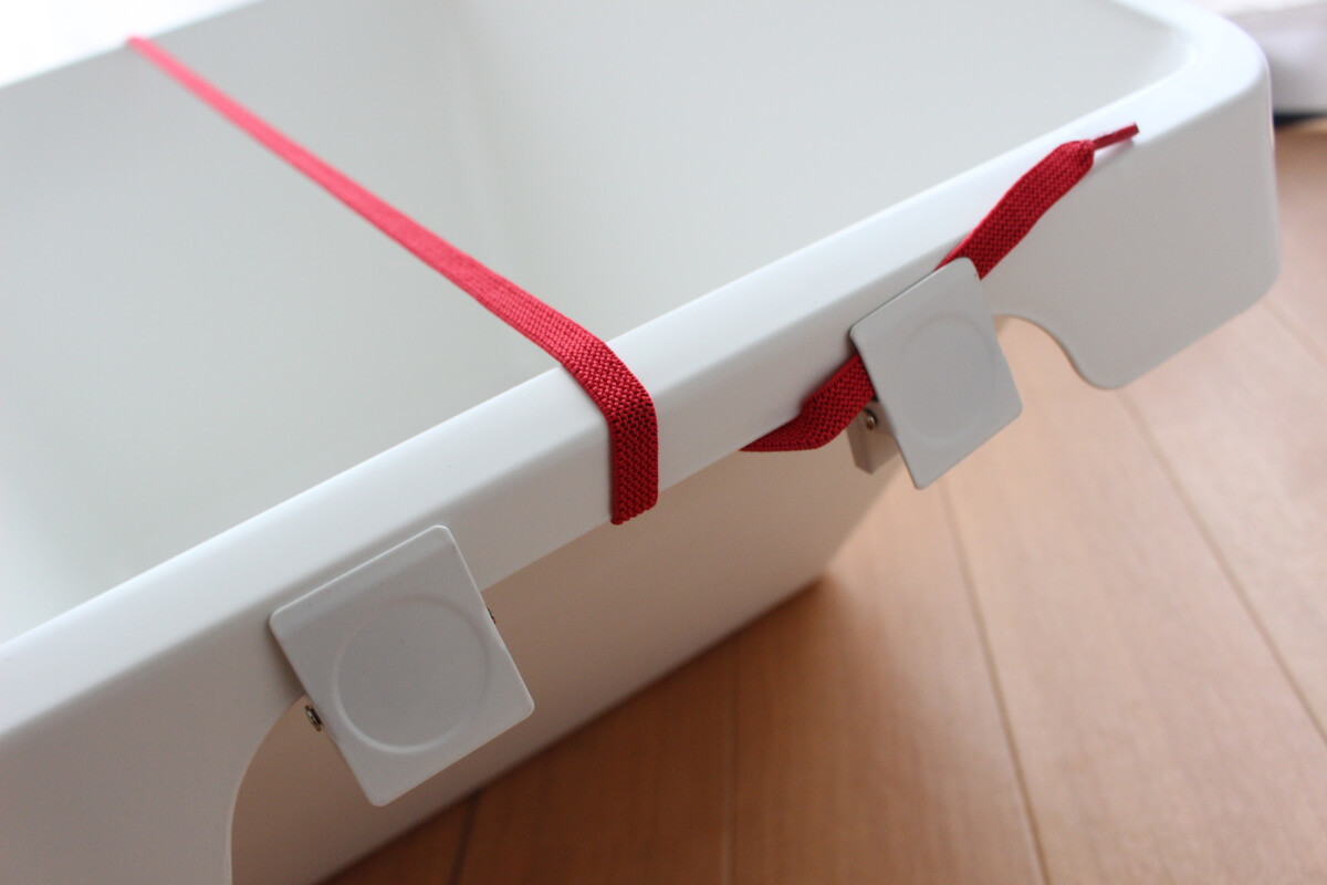 ゴミ箱と伸び~る靴ひもをストレスなく固定できるものはないか……と探した結果、マジカルテープがぴったり!