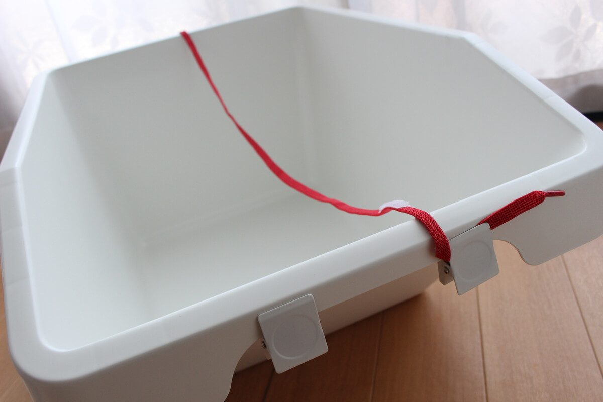 マジカルテープを使って靴ひもをピンッ!と張って、ゴミ箱の空間を2つに区切ります。