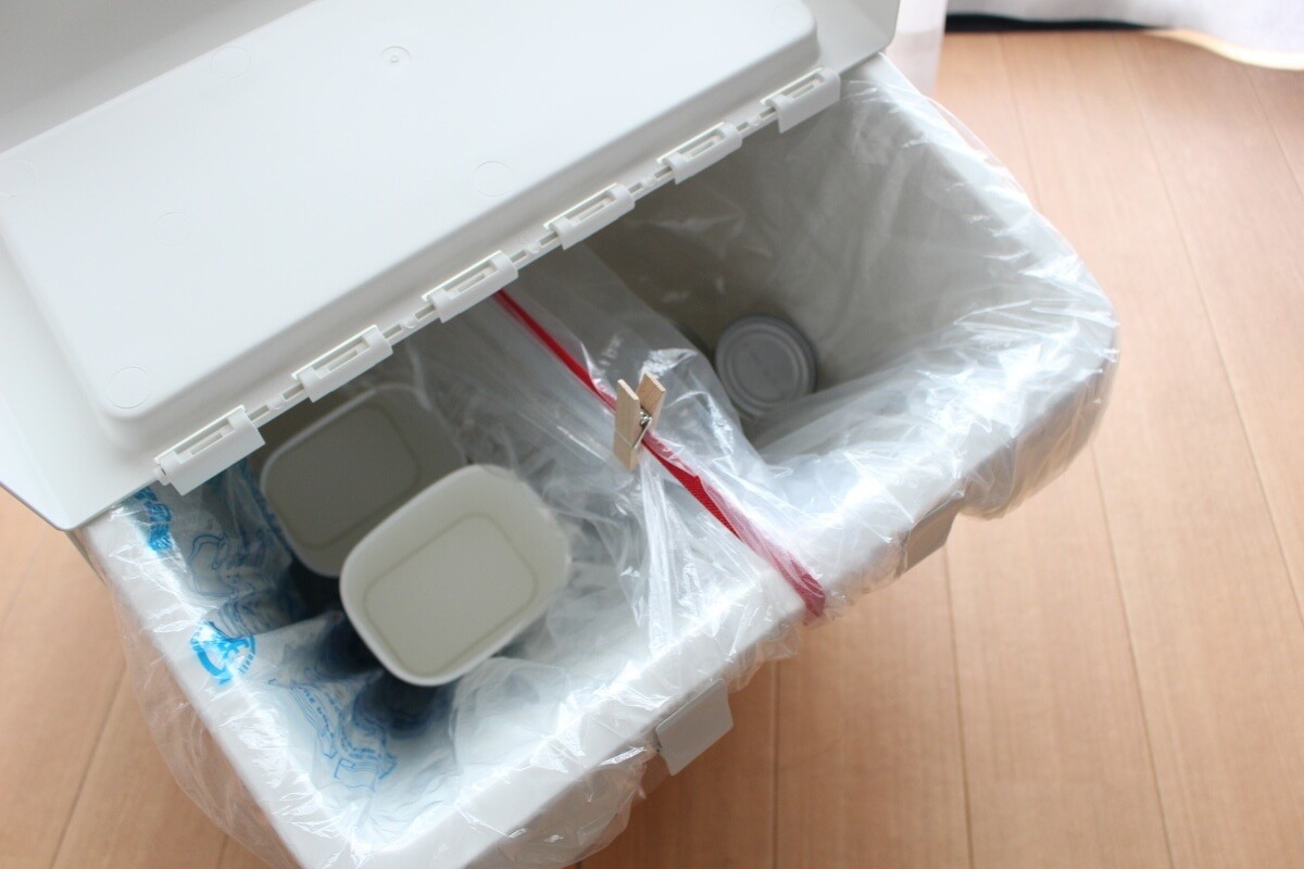 クリップでゴミ袋の手前をクリップで固定してみると……。