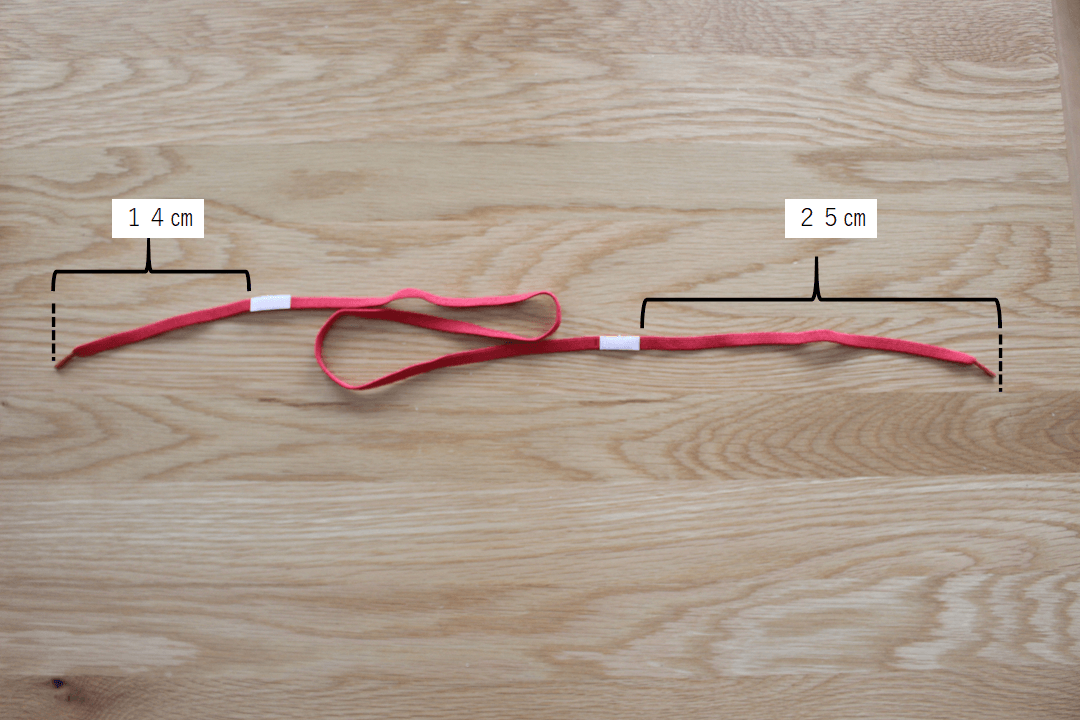 靴ひもの余りが多い方(25cm)をゴミ箱の後ろ側にすると仕上がりがとてもきれいです。