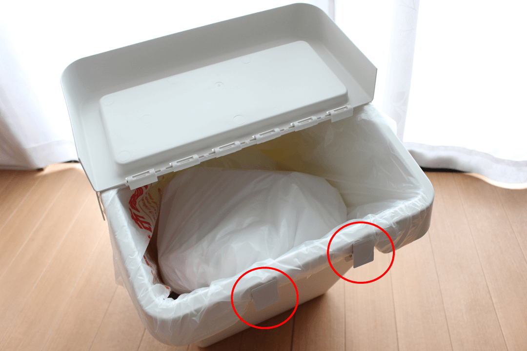 ソルテーラのゴミ箱(60リットルタイプ)にゴミ袋をかける場合はこのようにフロント部分を2箇所クリップで固定します。