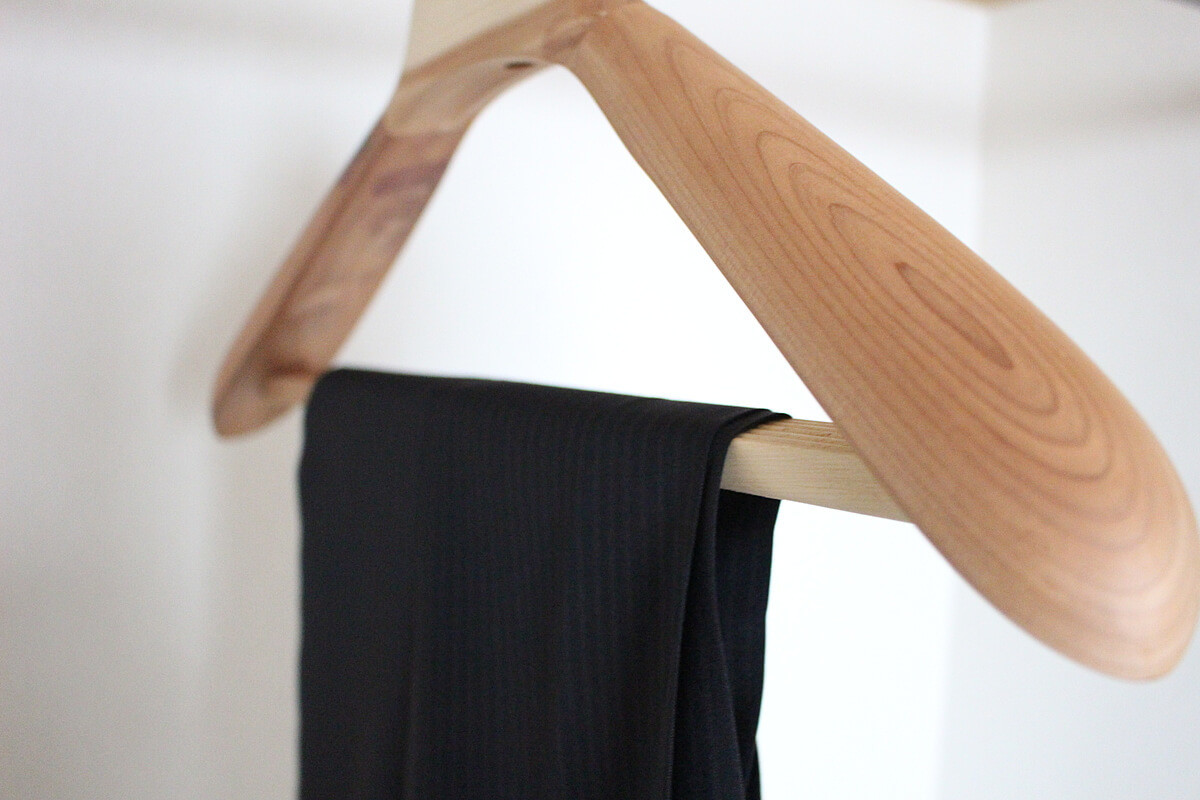 プラスチックのハンガーに掛けるより、木製にすると自然と衣服を大切にできます。