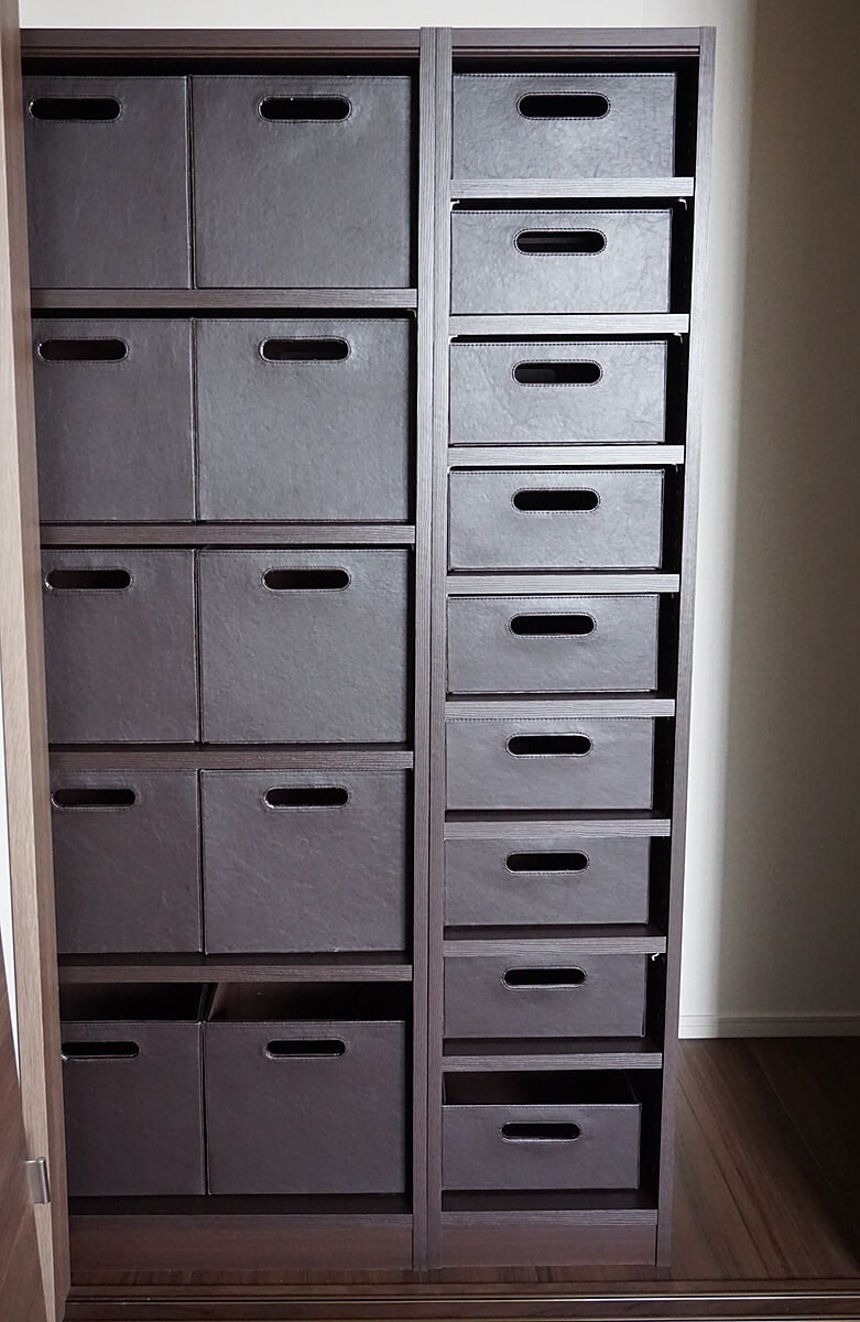 セミオーダー式のボックスは、ニトリの収納ボックスがぴったり収まるように内寸と棚板の厚みを計算して注文しました。