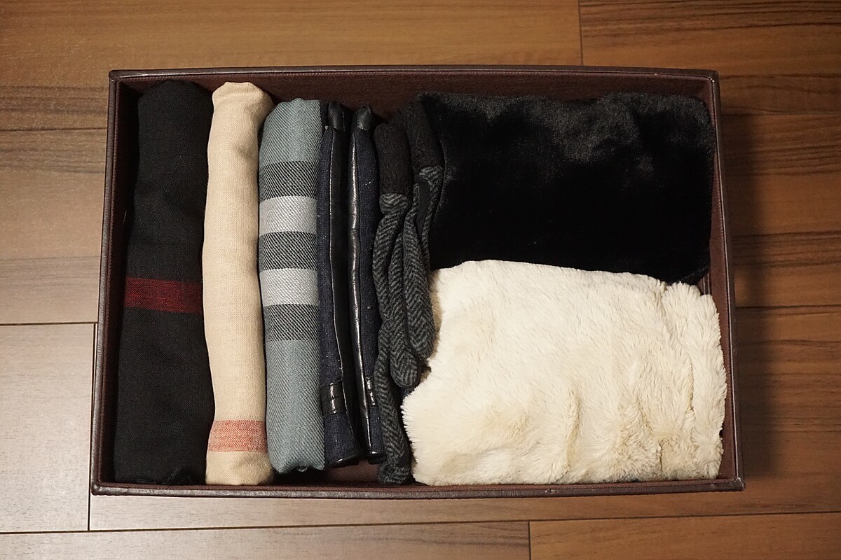 ニトリの「バスケット モード ハーフ」にはストールやマフラー、靴下や下着などの小物を収納しています。
