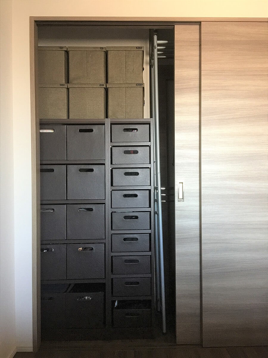 クローゼット内は吊り棚などは作らず何もない空間にしたため、自分でクローゼットの収納方法を考えました。