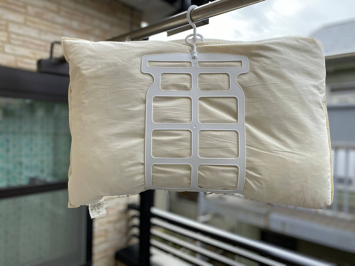 こちらが我が家でヘビロテしている洗濯グッズ「枕干しハンガー」です!これを購入してからはこまめに枕を干せるようになりました。
