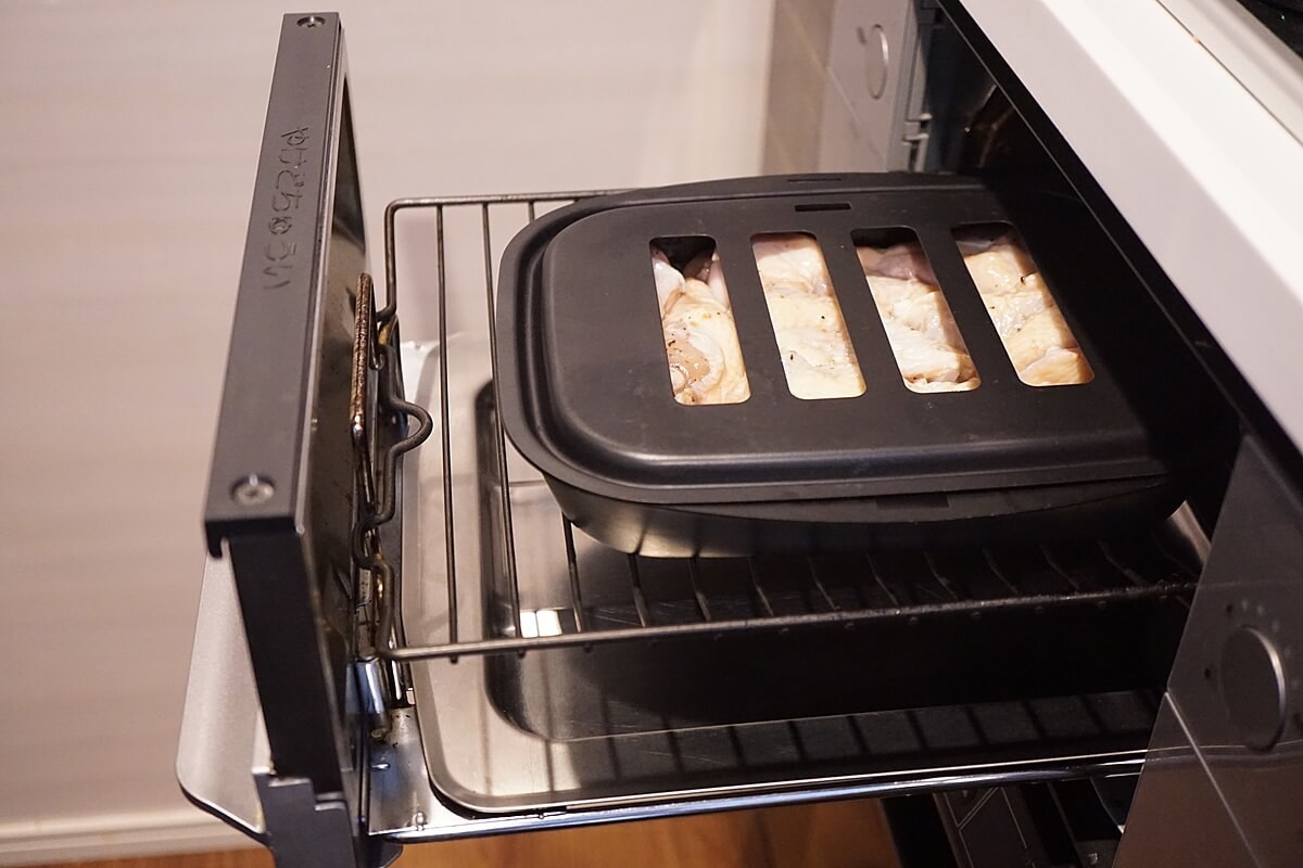 油の飛び散りを防いでくれる他にも、蓋をすることで水分がとばないので食材がふっくり焼きあがります。