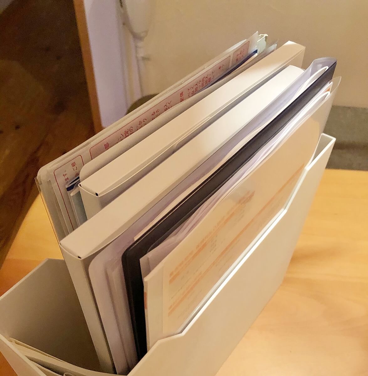 とりあえずニトリのファイルボックスの中にすべて収めているんですが、1つの書類を取り出すだけでも、ごちゃごちゃになってしまっていたものだから、さぁ大変。