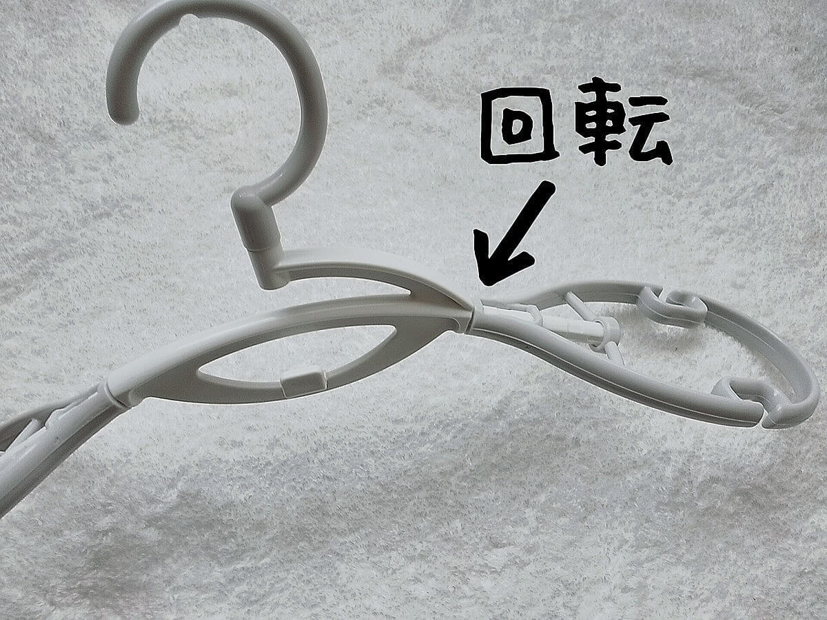 通常の洗濯ハンガーと異なるのが、アーム部分の構造です。 アーム部分は360度ぐるっと回転するので、洋服をかけたときに肩の部分が広がります。