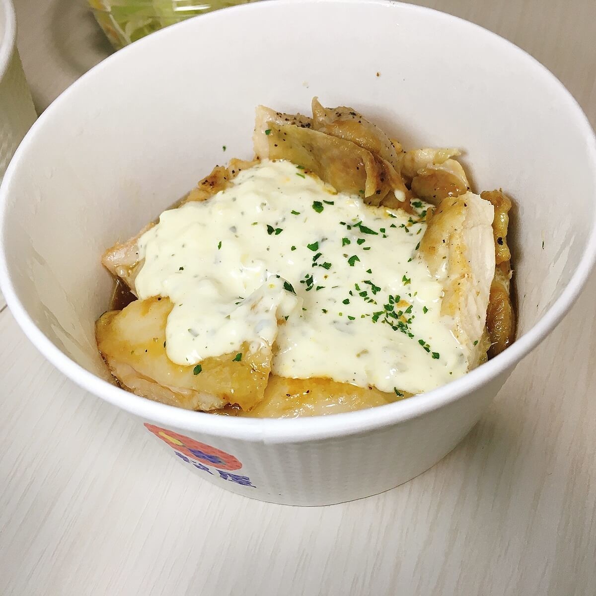 甘じょっぱいタレを絡めて焼き上げられた鶏肉はジューシー、玉ねぎの食感が残るタルタルソースはほどよい酸味でご飯がもりもり進みます。