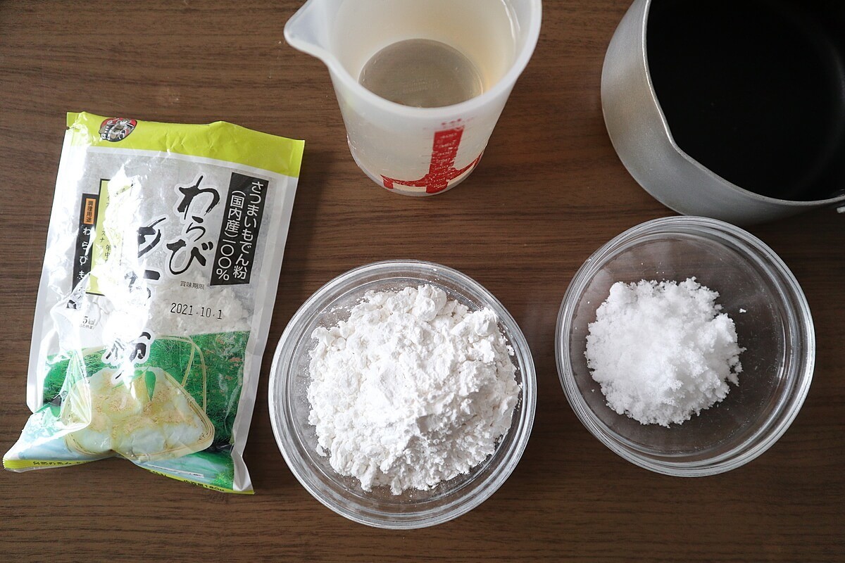 用意するものは、わらび餅粉と砂糖と水のたったの3つです。