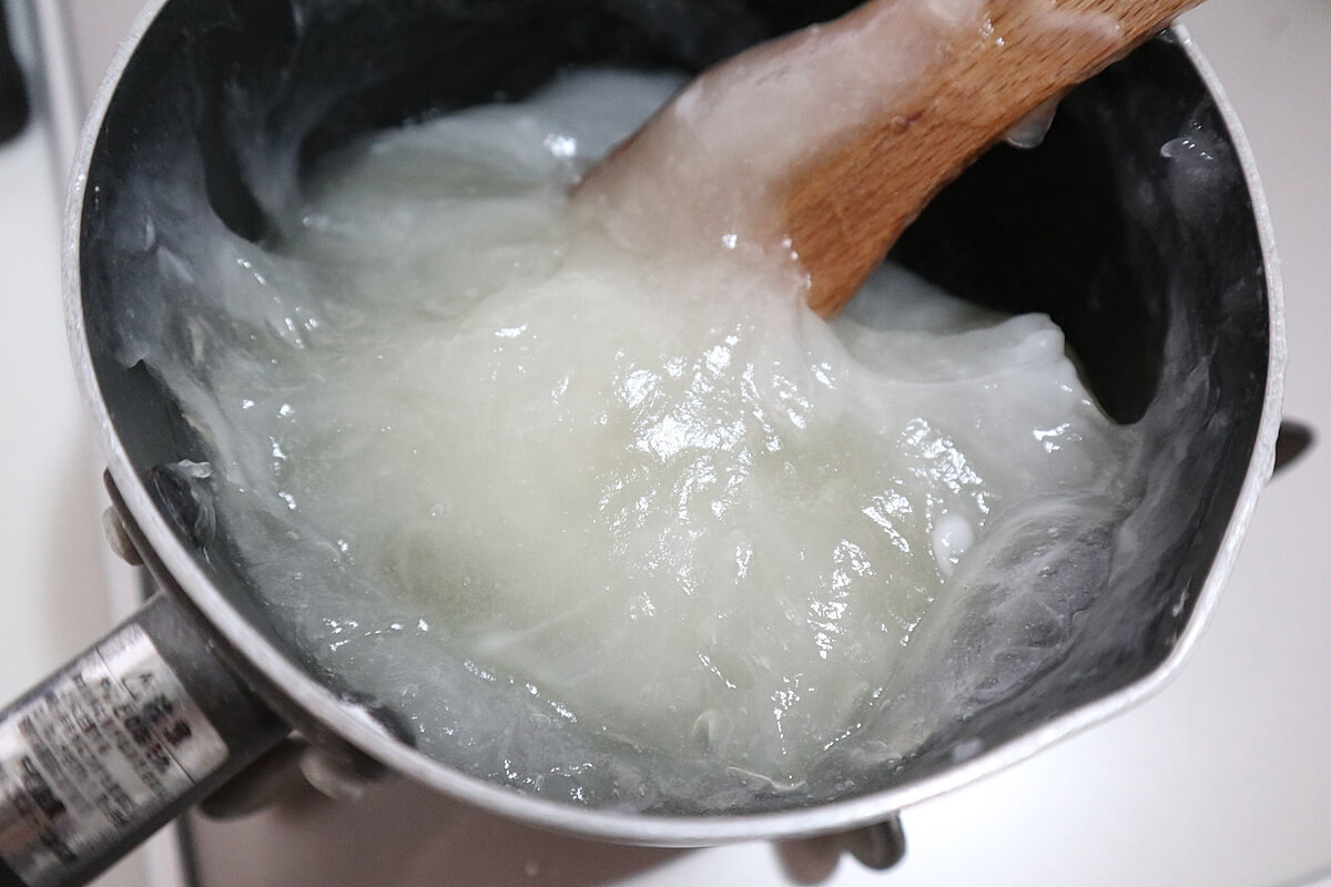 固まってきたら、弱火に変えて焦げないように底からしっかり混ぜて透明になるまで混ぜる。