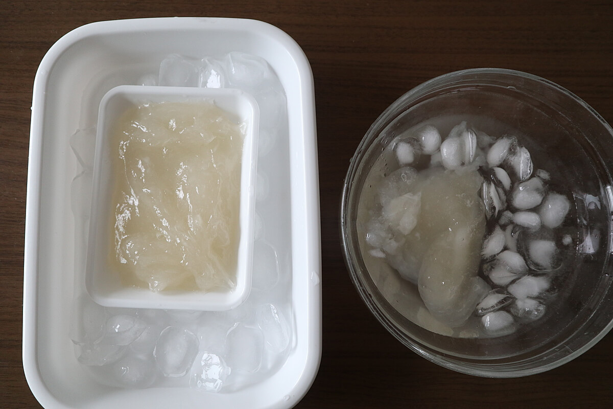 板状のものを包丁で切り分ける場合は、バットに流し入れて氷水で冷やします。