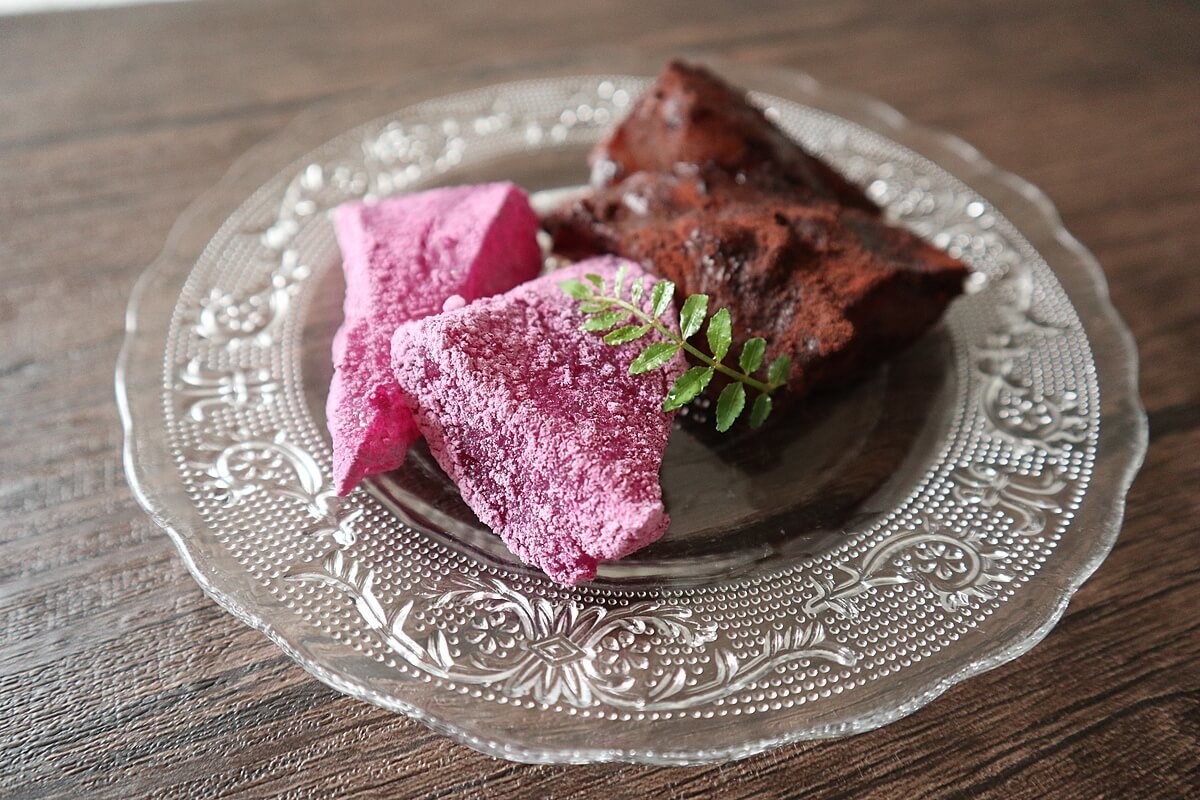 ココアパウダーはチョコレート餅のようになり、紫芋パウダーは見た目もお洒落で芋の風味が美味しいわらび餅になりますよ。