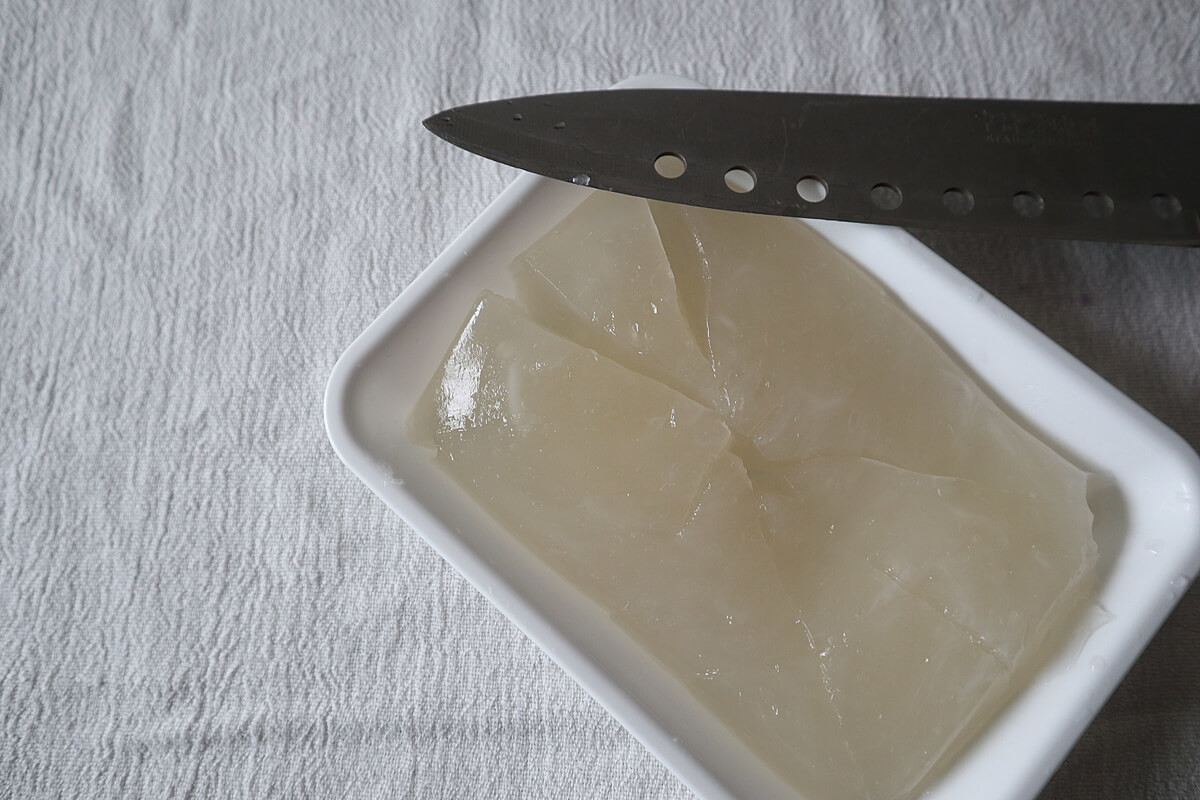 粗熱が取れた板状のわらび餅は包丁で切り分けると見た目も綺麗です。