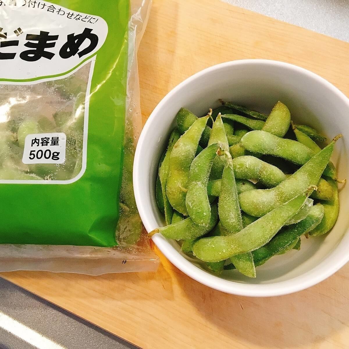 業スーには、もともとさやから出ている枝豆や、塩味のついているものもあるのですが、今回は無縁のさやつき冷凍えだまめしかなかったので、そちらで代用です♪