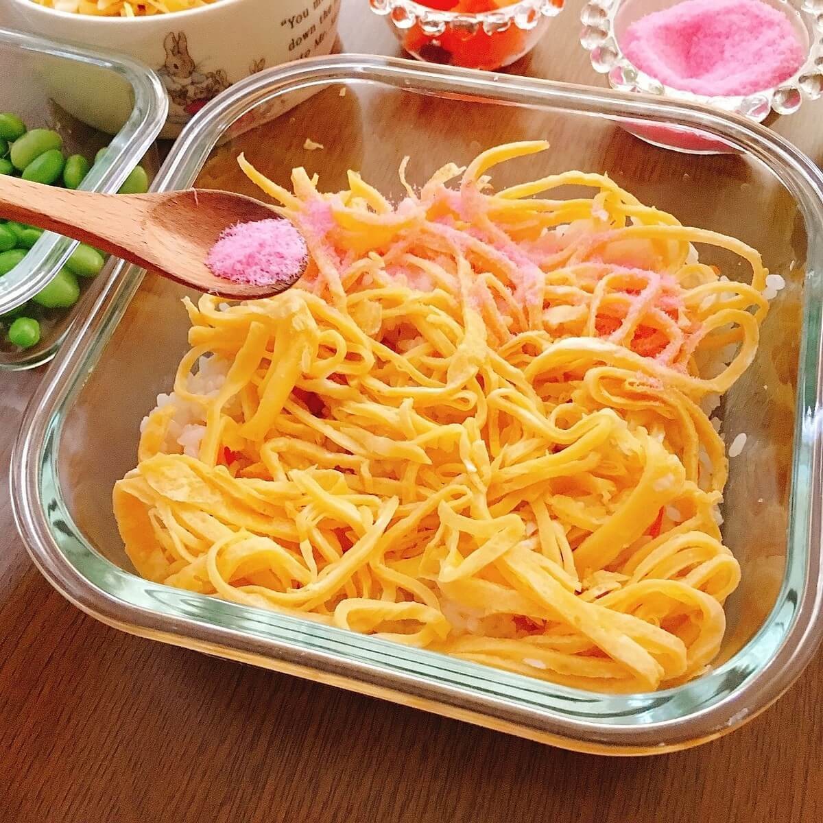 さらに上から、すし飯、さくらでんぷ、錦糸たまごを盛り付けます。