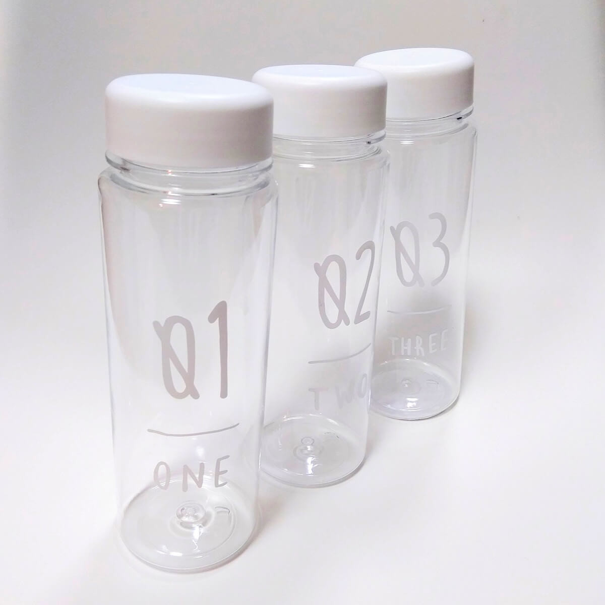 手描き風ナンバー 1・2・3 が可愛いキャンドゥのドリンクボトル。