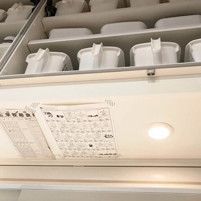 給食の献立は覗き込めば見えるキッチンカップボードの上部の底にマスキングテープで貼り付けて。
