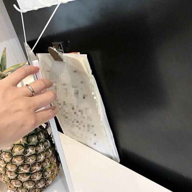 その他の書類は、冷蔵庫横にマグネット付きクリップに挟み貼り付けてホワイトボードで隠してました!
