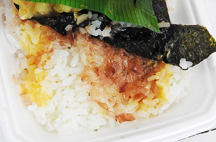 のりの下には、チェダーチーズなど4種チーズソースとおかか。「4種類のチーズ」と聞くと結構チーズの味が主張してくるのかと思いきや、チーズはあくまでもアクセント程度にしか感じ取れませんでした。のりの上にある白身魚フライやちくわ天などの方が味が濃いため、チーズのインパクトはさほどなく……。