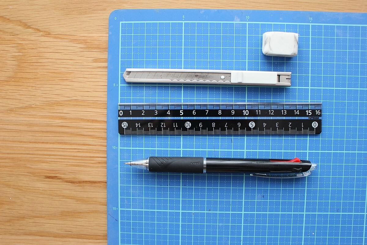 用意する道具は、工作マット・消しゴム・カッター・定規・シャーペン(鉛筆)です。