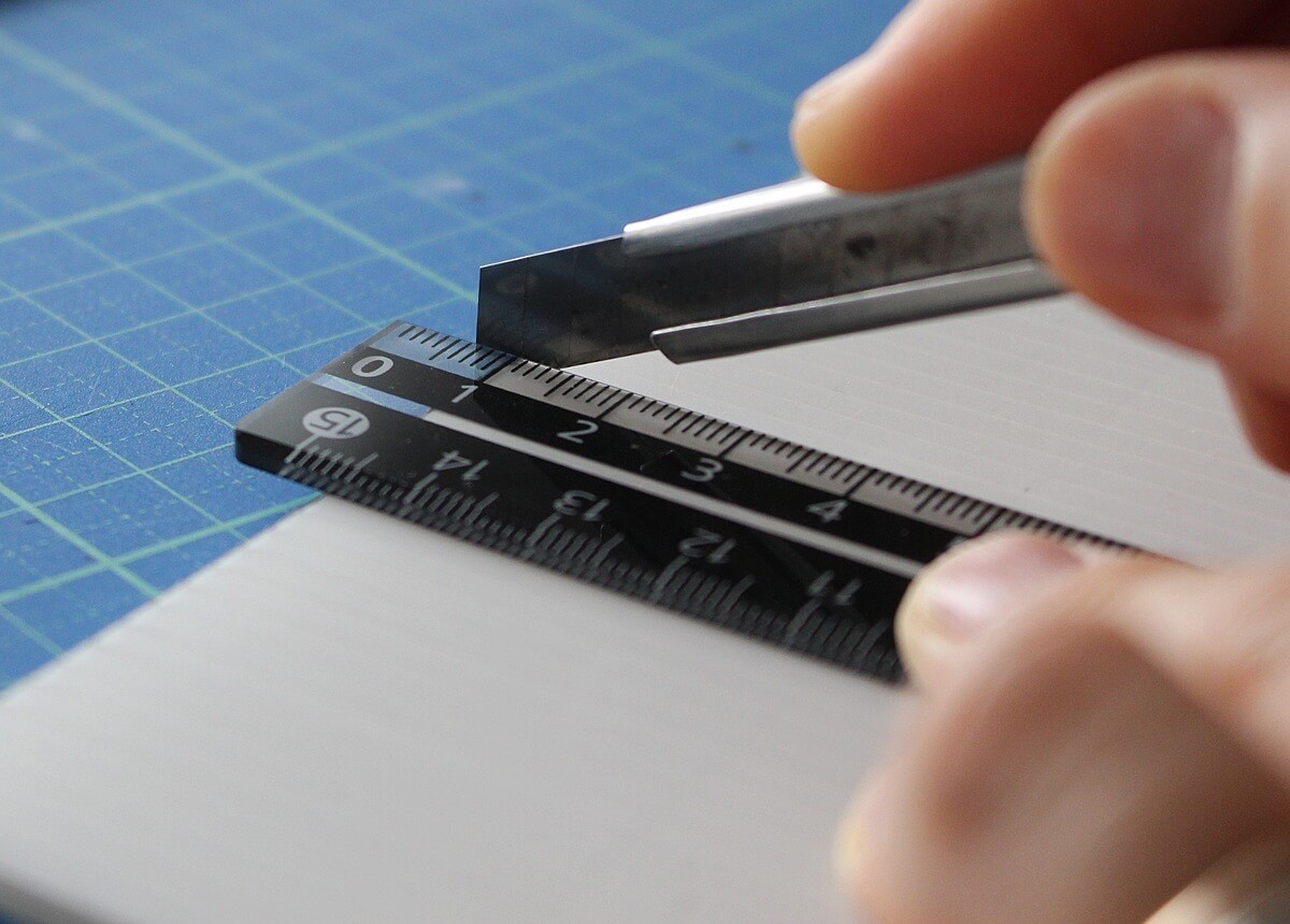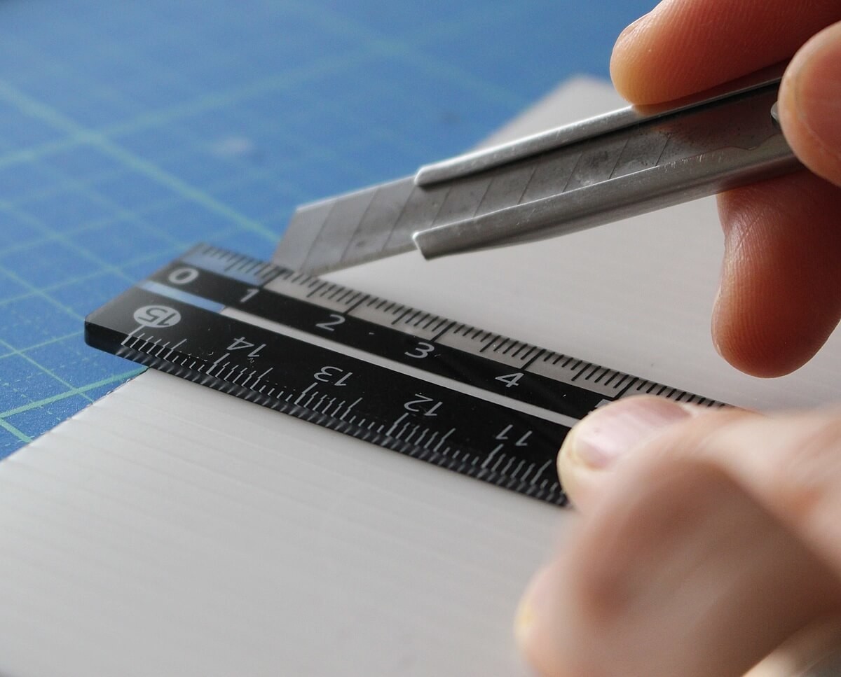 プラダンをカットするポイントは、定規を当ててプラダンに対してカッターナイフを垂直にします。