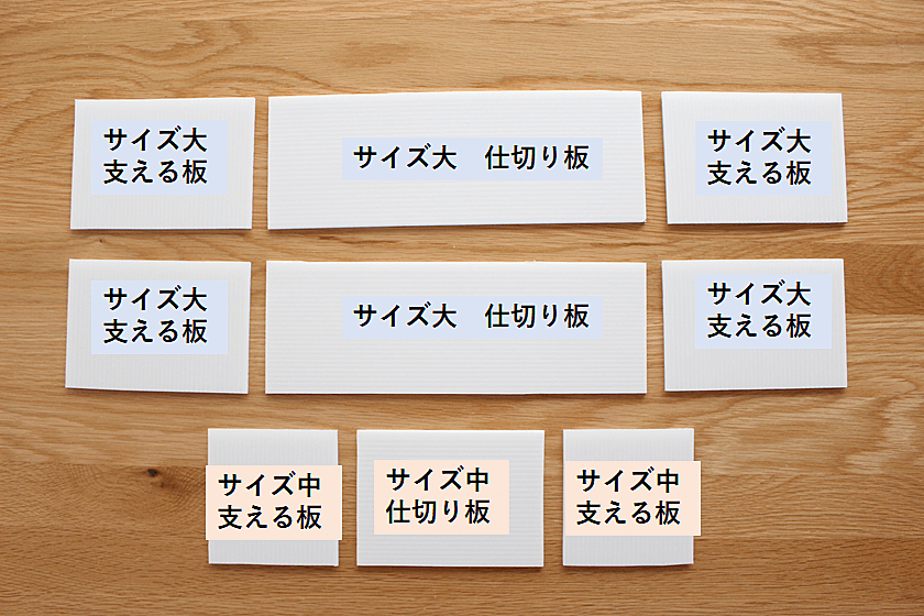 ここでは、使いやすいサイズをできるだけプラバンを使い切るように意識しながら、サイズ大(28×28×13cm)の仕切りを2セット・サイズ中(28×14×13cm)の仕切りを1セット作っていくことにします。