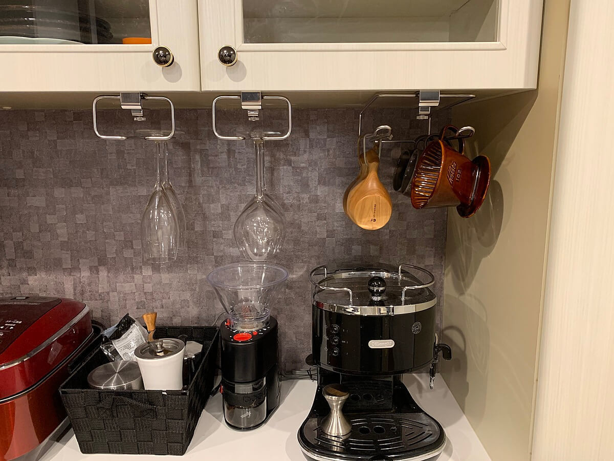 お気に入りのコーヒーカップも、陶器製のコーヒードリッパーも、できれば割らずに長く使いたい!そこで、ワイングラスハンガーと同様に、こちらも吊り下げ式を採用しました。