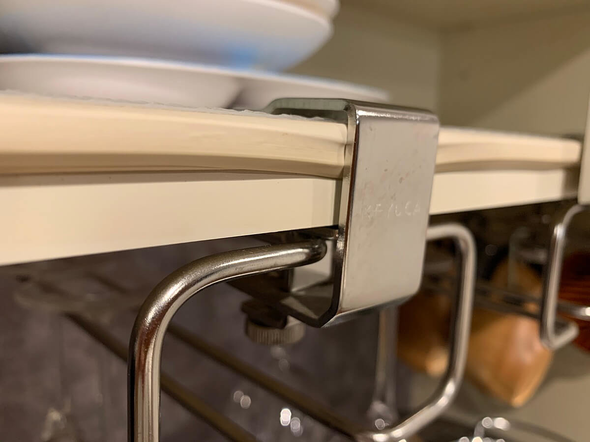 カペラIIティーカップハンガーは、ワイングラスハンガーと同じく、吊り戸棚や食器棚に固定できます。こちらも取り付けられるのは1.5cm〜3cm幅の棚板です。